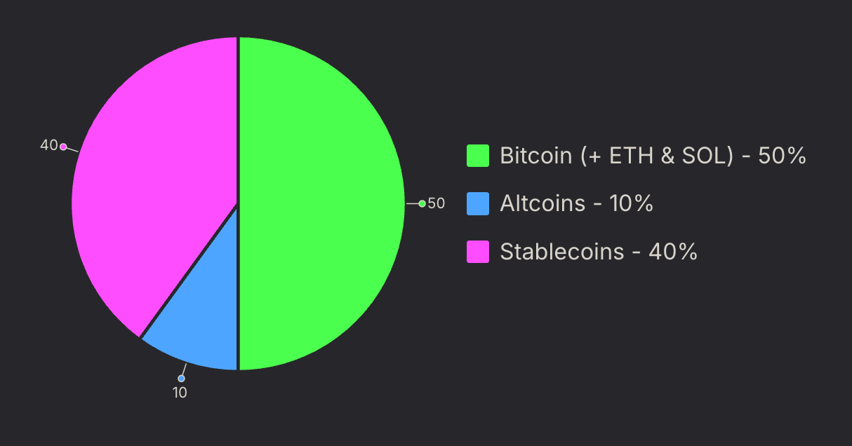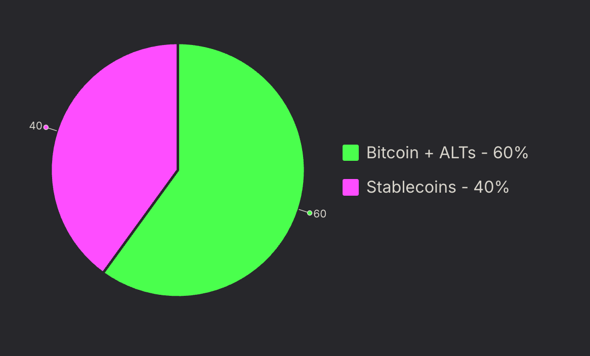 Here you would hold 60% in volatile crypto assets like Bitcoin and other Altcoins, and keep the remaining 40% in Stablecoins earning low-risk yield for you, perhaps with something like Aave or SparkFi.
