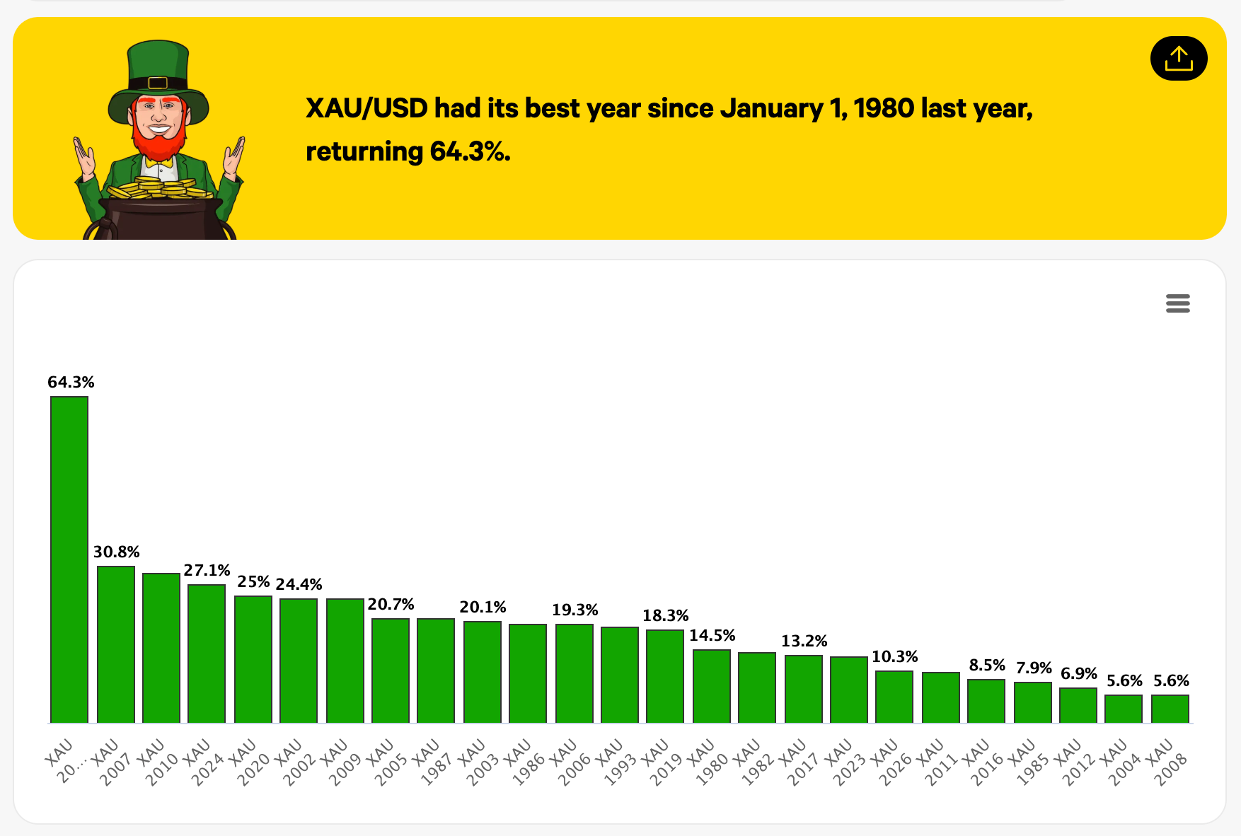 Last year marked best year for Gold since 1980 with the second best in this period being 2007 when Gold return 30%, which is still half of what it acheived last year!