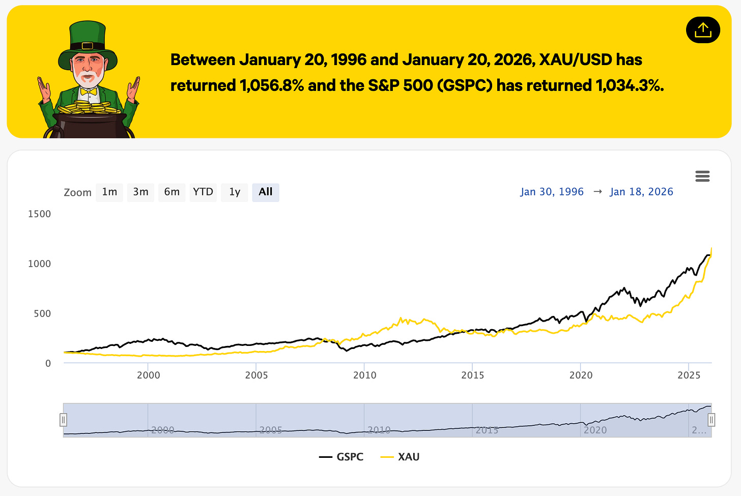 Furthermore, thanks to last year’s growth Gold and the S&P500 have now given pretty much the same return over the past 30 years!
