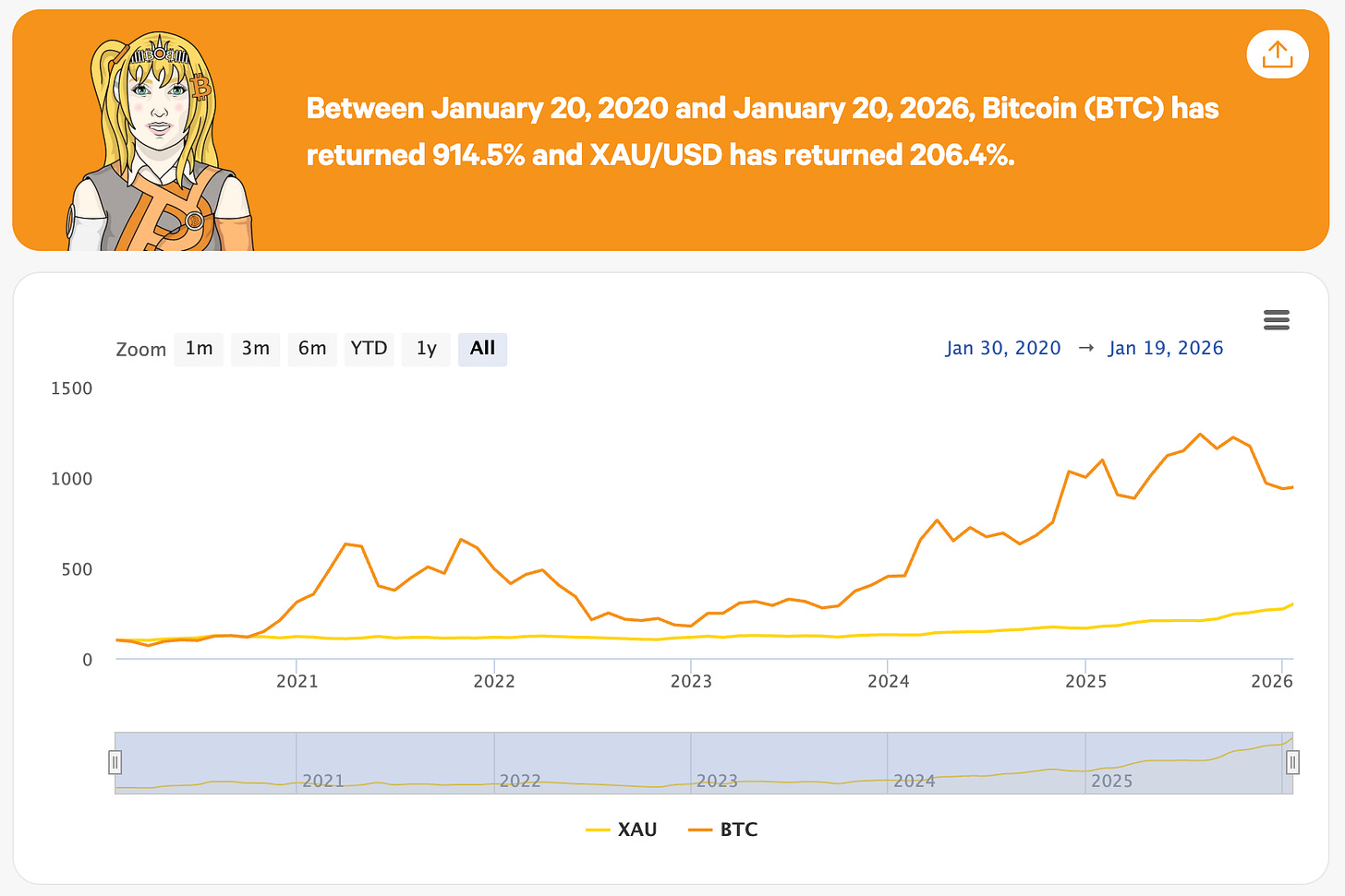 Gold’s outpaced Bitcoin’s returns in recent years, but nothing’s changed in Bitcoin’s core thesis and if anything it just shows there’s more space for it to grow.