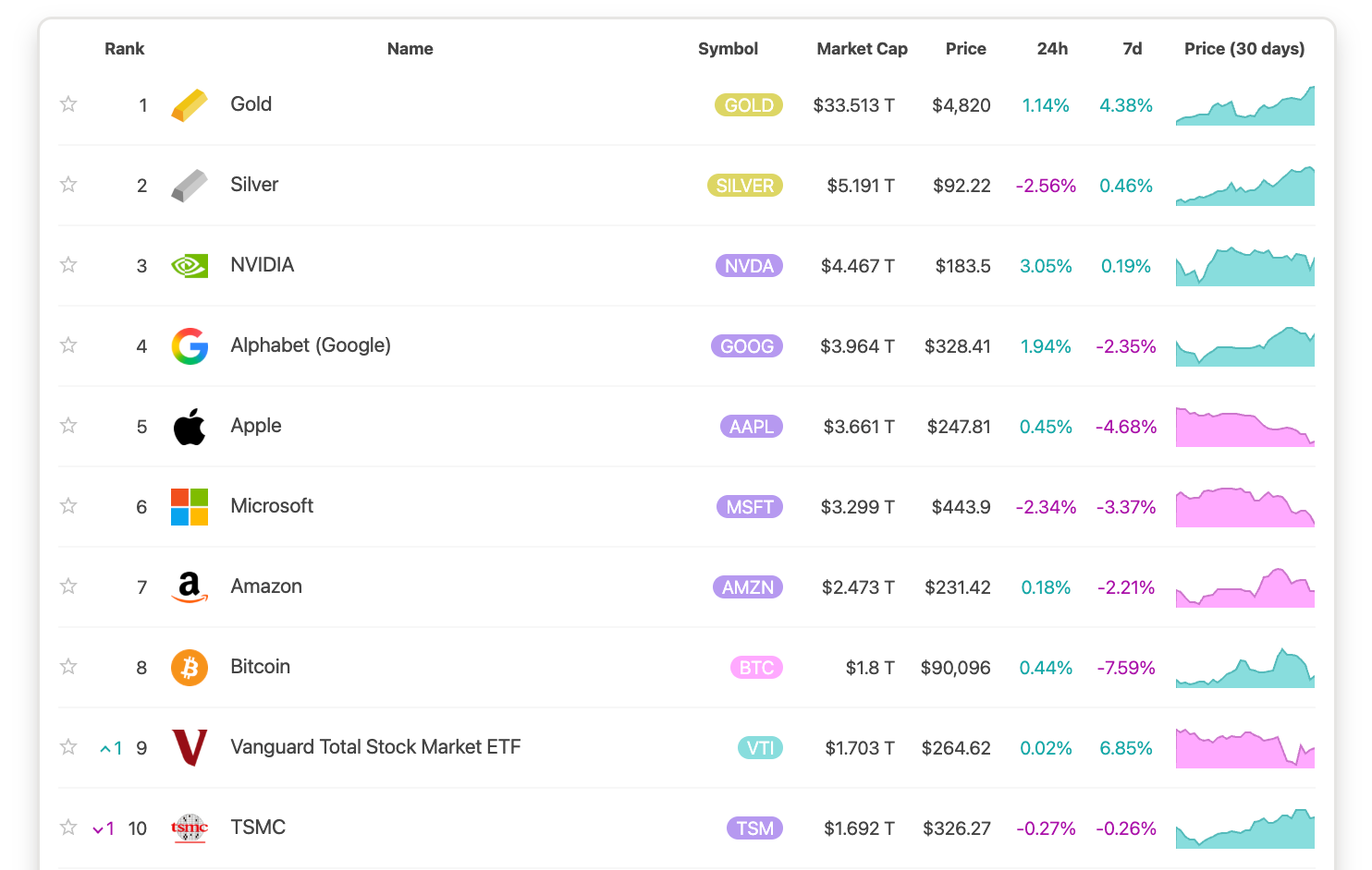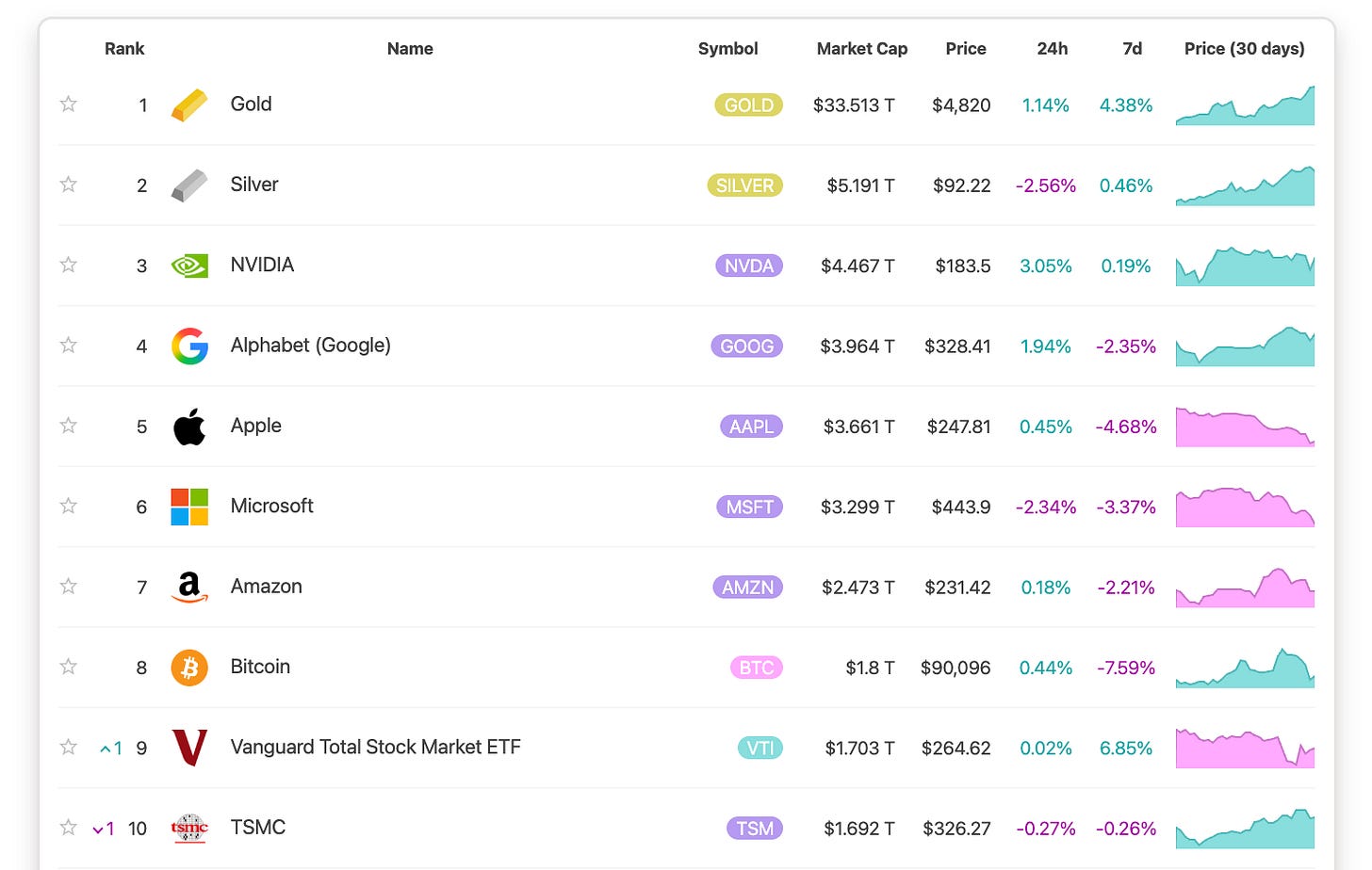 Gold and Silver are the top precious metals in terms of their scarcity and perceived value, and they’re now also the top 2 most valuable assets by market cap in the entire world with $33tn and $5tn market caps respectively.