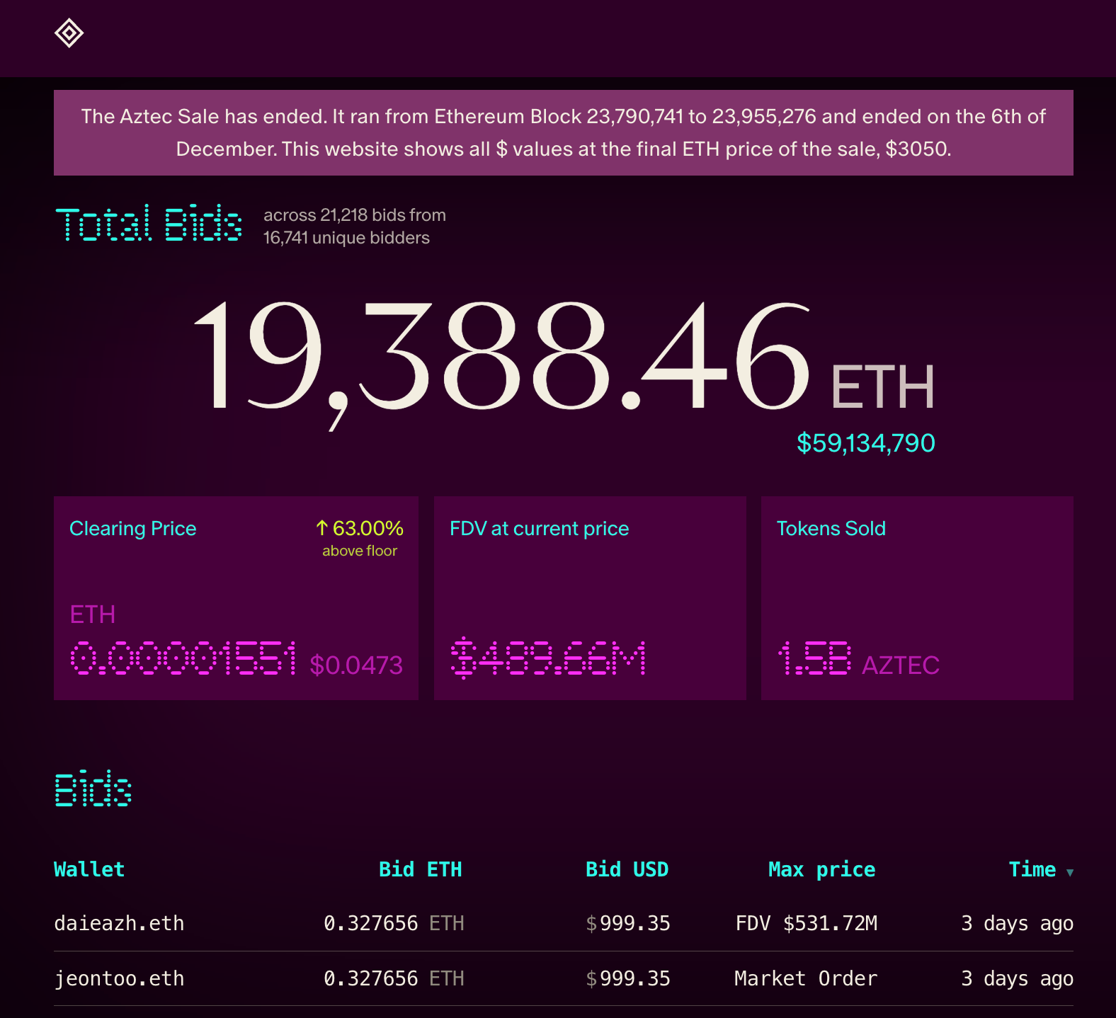 The end result of their CCA was that the 1.5bn tokens were successfully sold for almost $60m worth of ETH, meaning that their FDV ended up at $489m, which was 63% higher than their anticipated $300m floor.