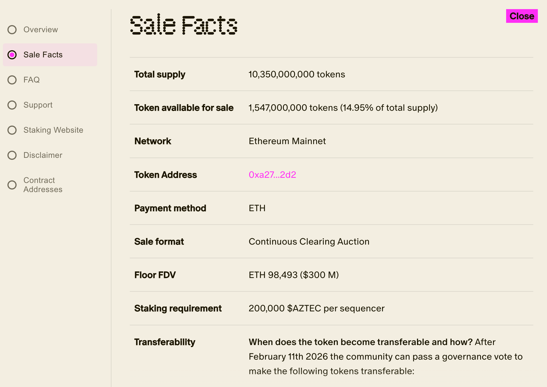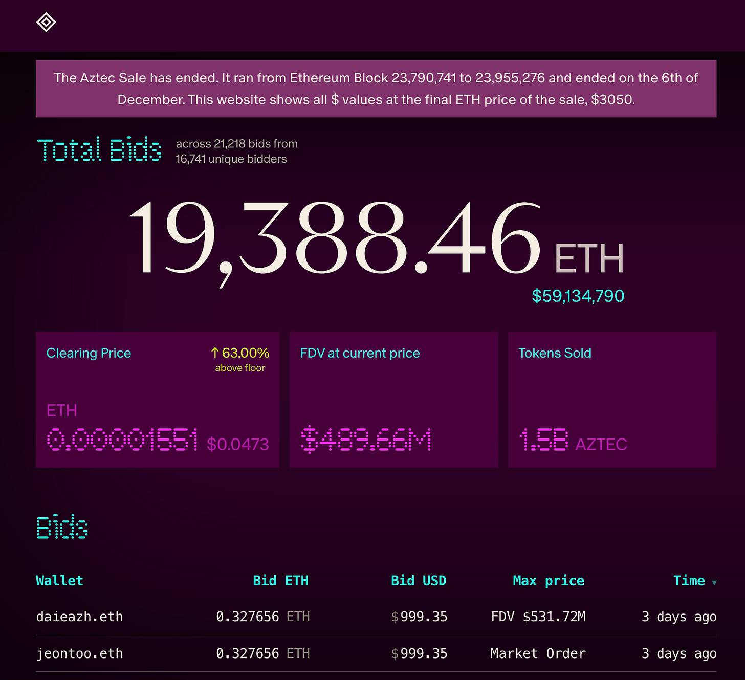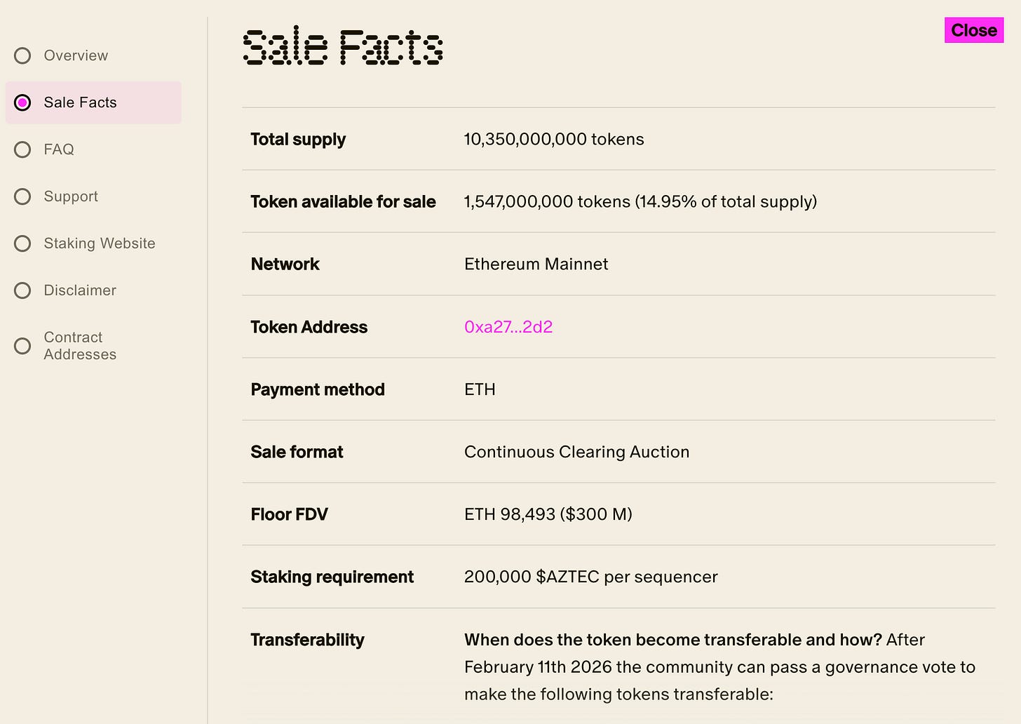 In the case of Aztec they made around 1.5bn tokens available to be sold in their CCA, around 14.95% of their total supply, and set a minimum floor FDV of $300m by setting a floor price of ~$0.03 per $AZTEC token.