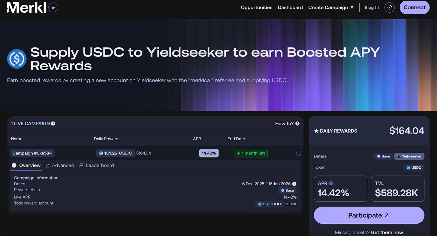 If this is your first time using Merkl then you might want to get started with our yieldseeker campaign just to trial it out and see how you find using the platform - https://app.merkl.xyz/opportunities/base/ENCOMPASSING/0x09bc81decb109599f38cc1edf52ec5109b8185ba