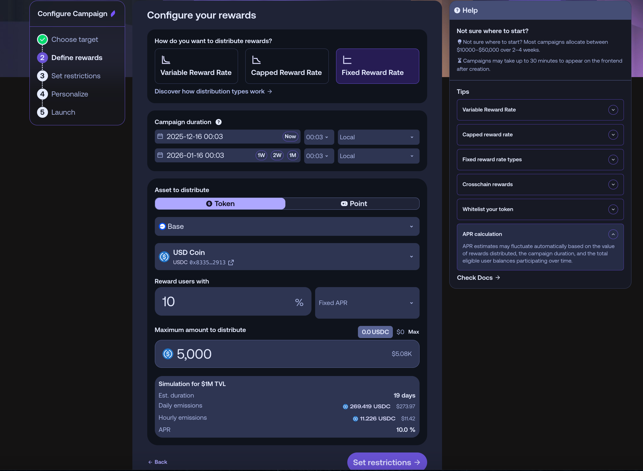 Next you must define the rewards where you can set a lot of different variables like: fixed or variable rewards, points or tokens, the chain of the token, rewards as fixed/variable APRs or daily reward amounts, and the maximum amount to be distributed.