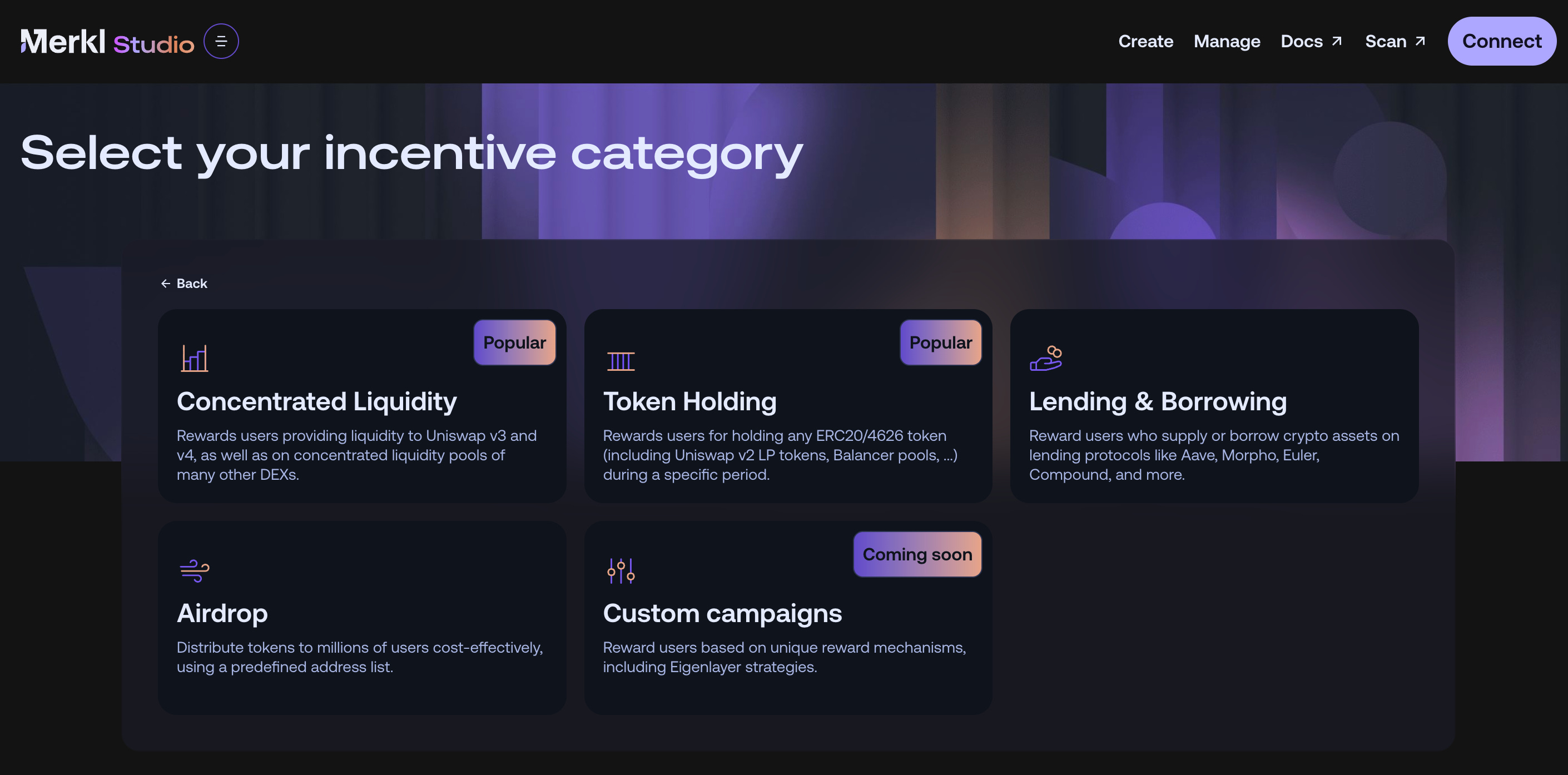 To get started here you need to select “Distribute Incentives” on the landing page or “Create campaign” on the app page and you’ll be taken to Merkl Studio.