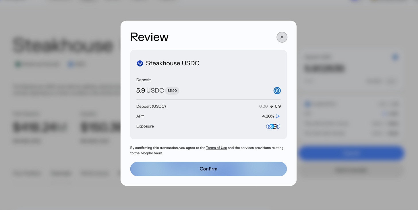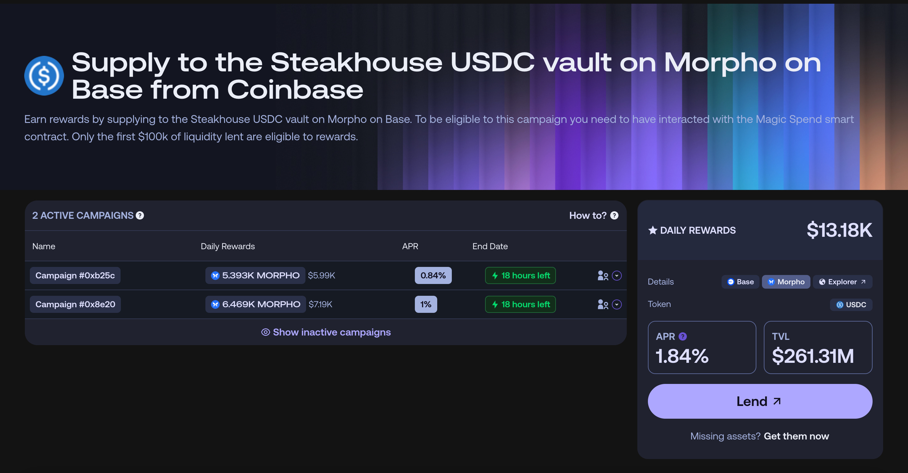 By selecting a campaign that you’re interested in you’ll be taken to a screen showing more information about it. For example you can see below there’s currently a couple of campaigns running for supplying USDC to the Steakhouse vault on Morpho.
