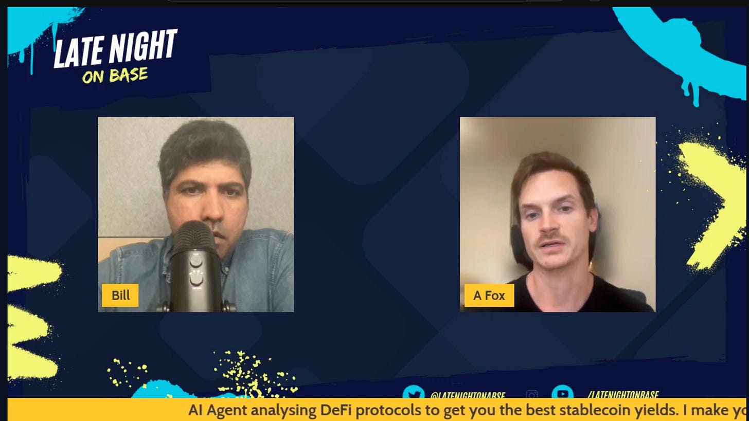 A few weeks ago in December I recorded a 30m podcast with Bill the Bull for his “Late night on Base” show about our project Yield Seeker, I shared it on X but hadn’t shared it on my Substack yet and so I decided to do so this week.