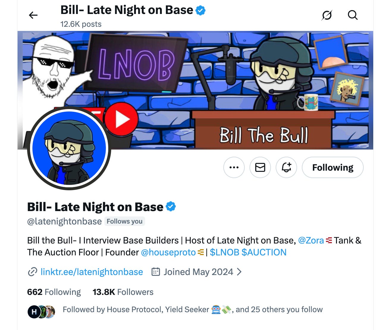 Bill the Bull is a creator in the Base ecosystem who’s got his own show called “Late Night on Base” (LNOB) where he does streams and podcasts with builders in the space. He’s active on the Base App, on X, Spotify and on Youtube with his content and has even interviewed influential people like Jesse Pollack who created Base.