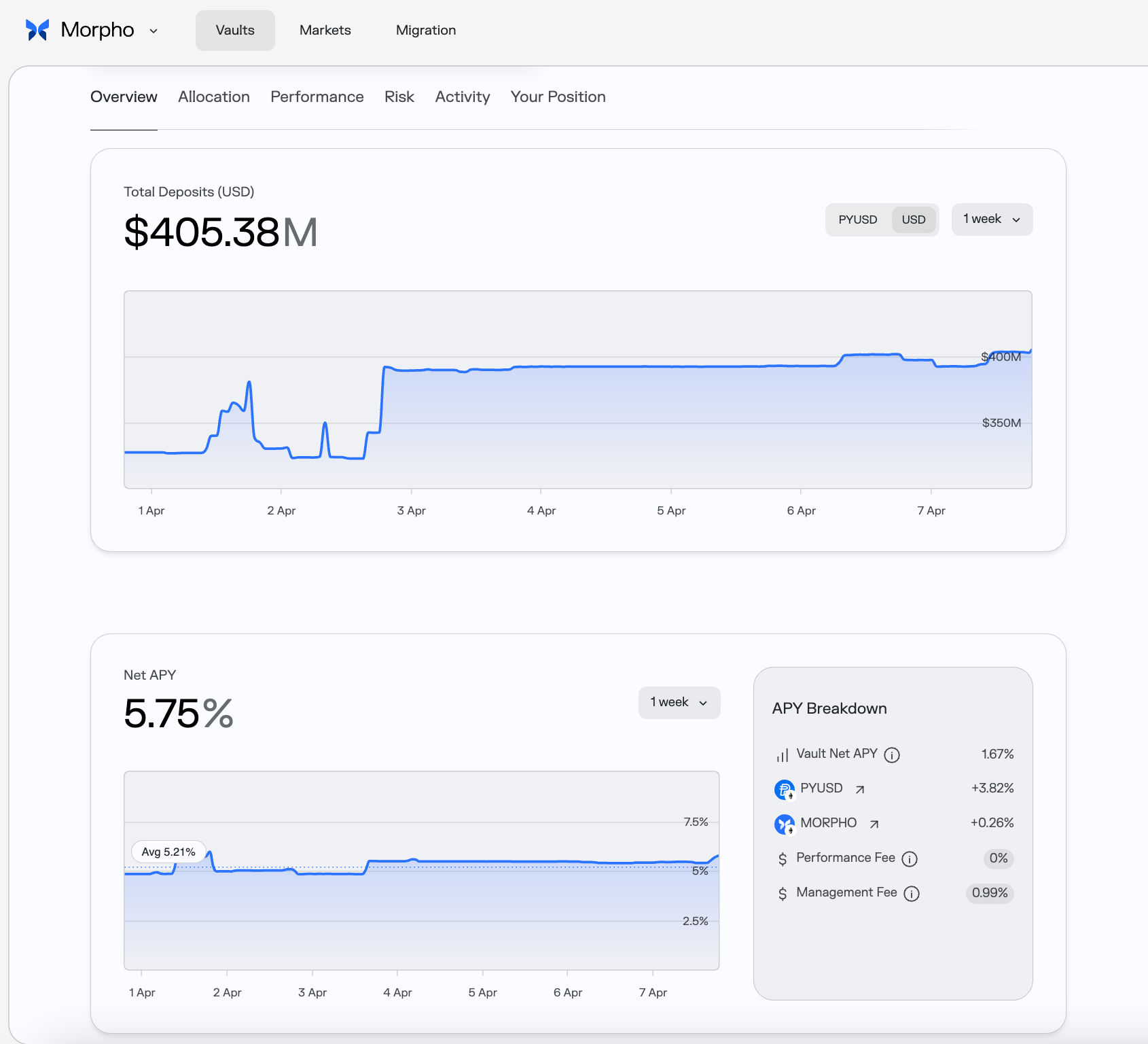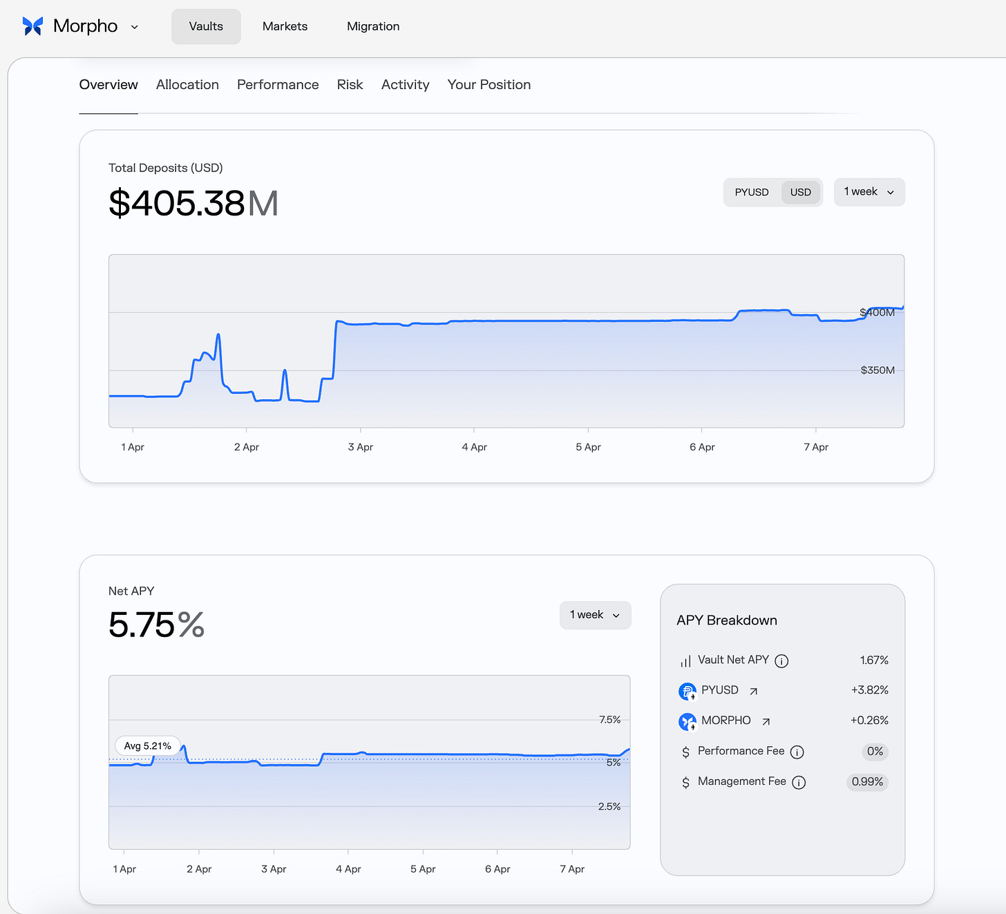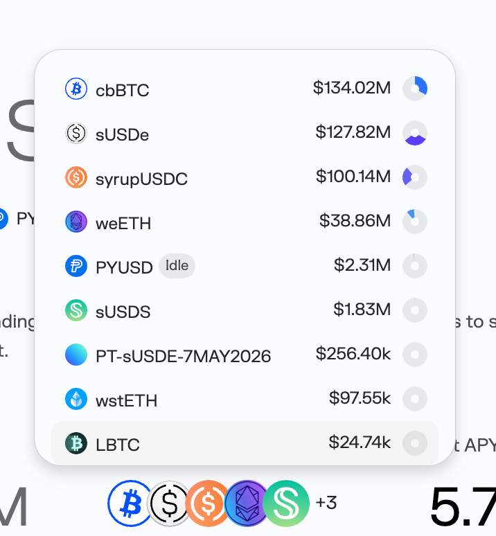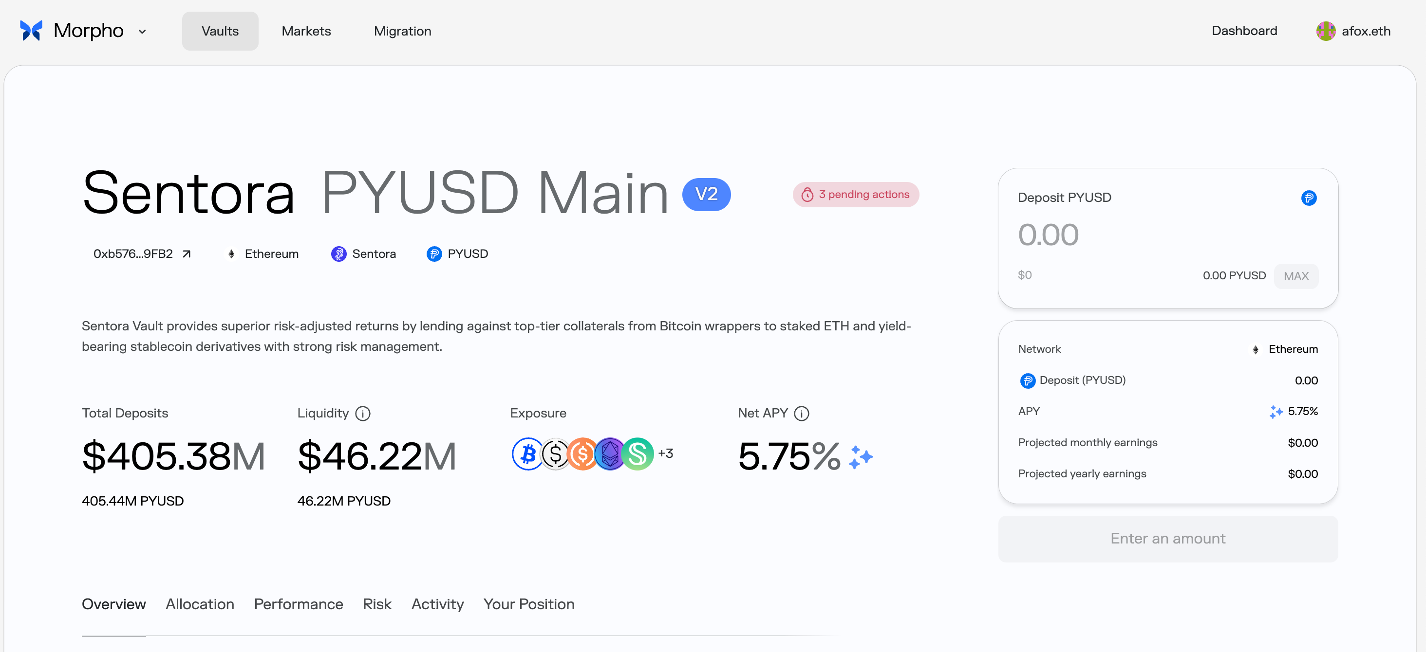 When you select a vault it shows you the curator behind it, the assets it lends against, and a breakdown of where deposits get allocated. For example if we click on the top option here “Sentora PYUSD Main” you’ll see the following: