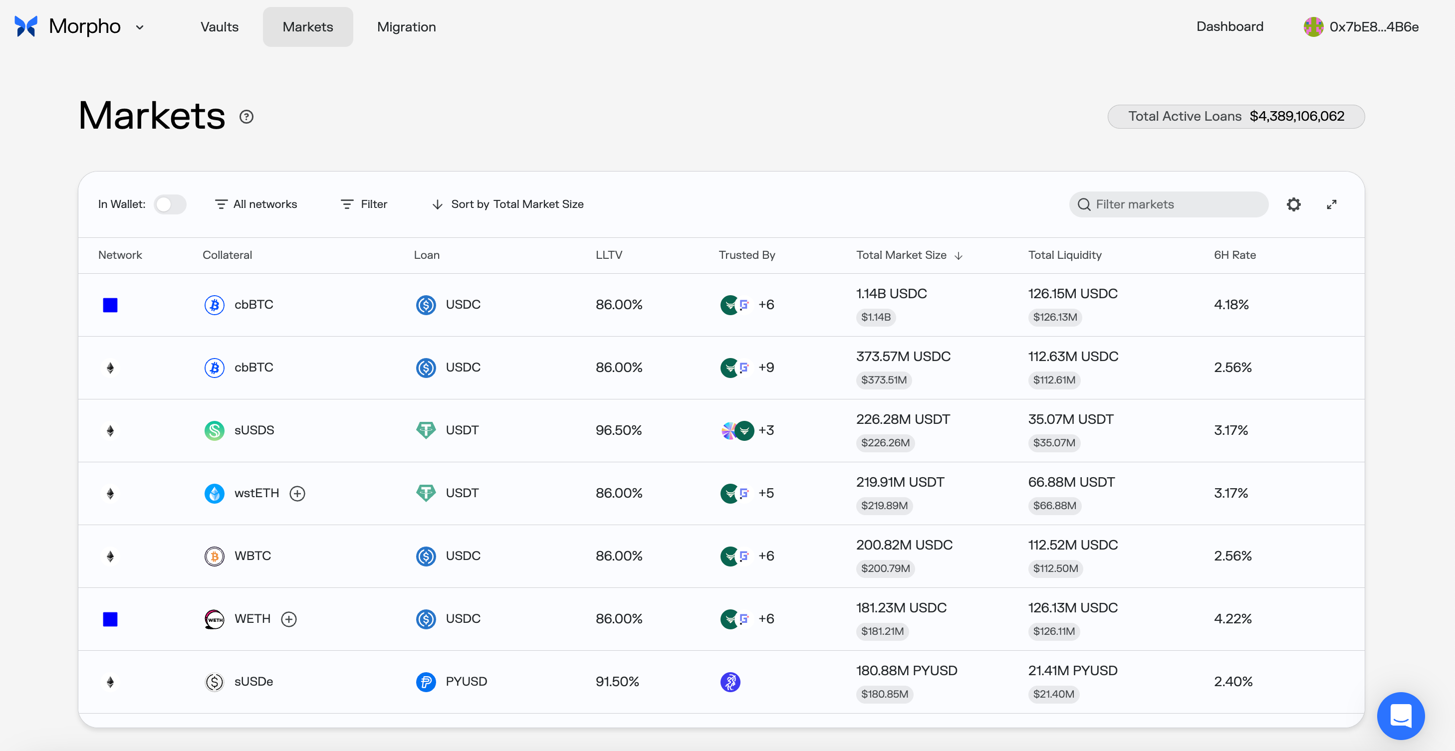 The borrowing experience on Morpho is the other side of the equation, all you need to do is select “Markets” on the navigation bar to see it.