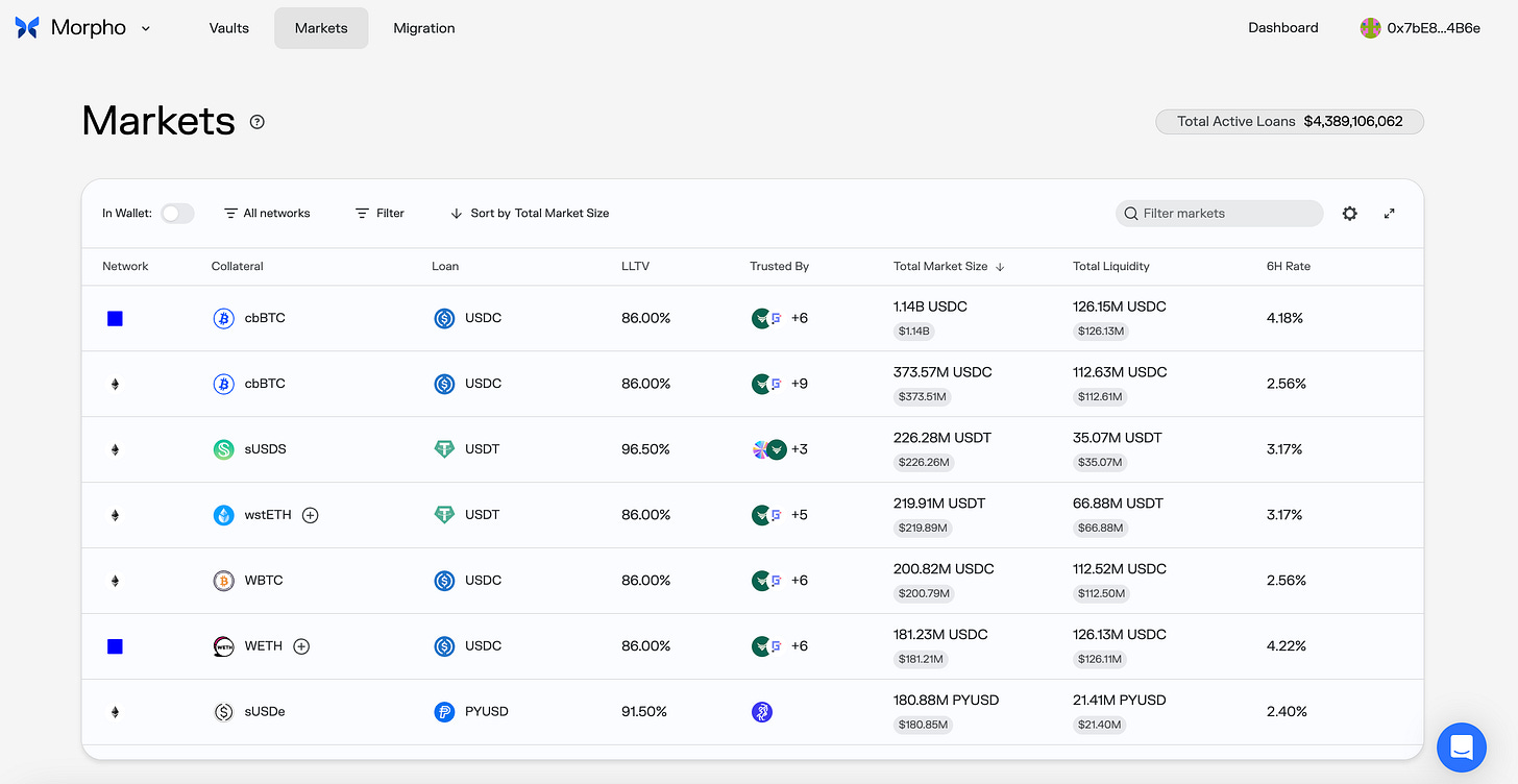 Below you’ll see how to lend via vaults or borrow through markets, with liquidation thresholds, interest rates, and risks all visible upfront.