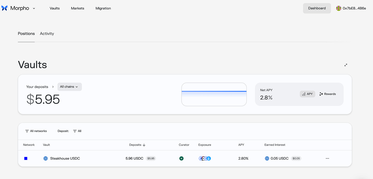 You earn yield automatically as borrowers pay interest into the markets your vault is allocated to, and you can withdraw at any time. Your dashboard will then show your positions at any given moment.