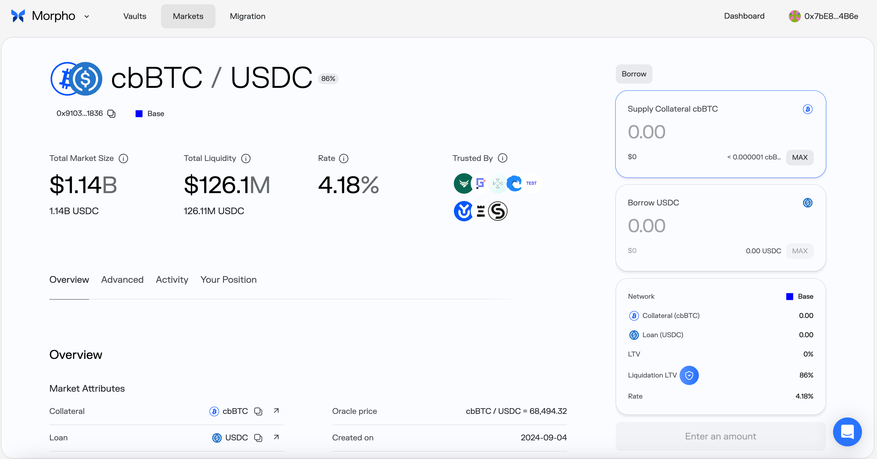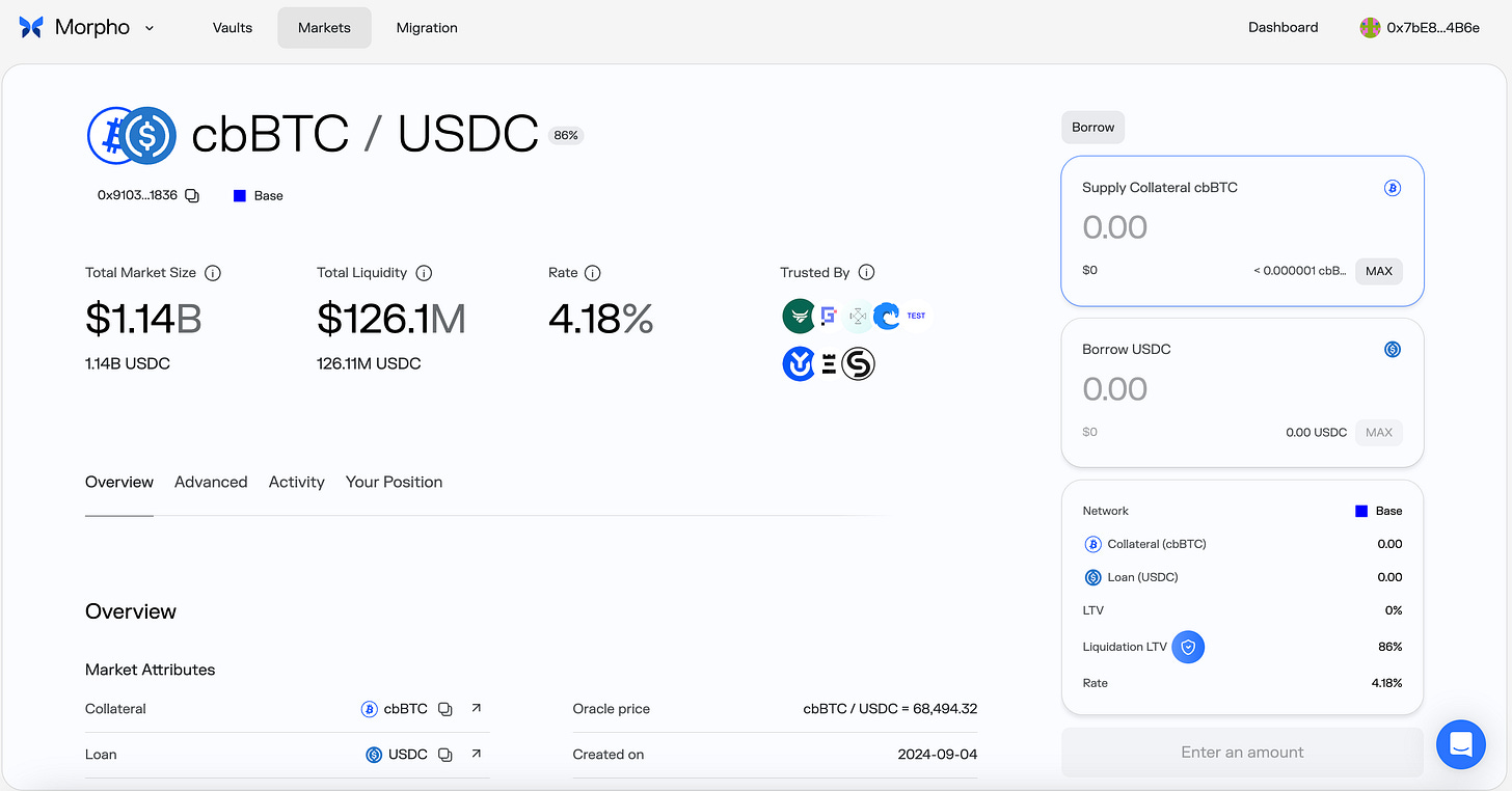 Here you can see the collateral needed to borrow against for each individual market. If you select the top one for example you’ll be able to put cbBTC as collateral and borrow USDC.