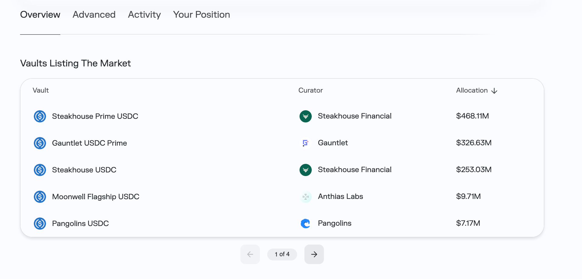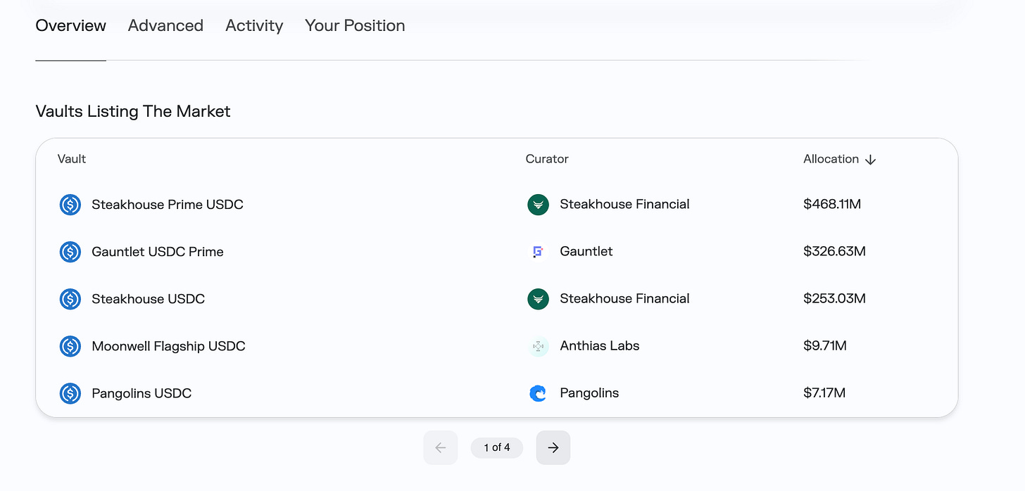 Many vaults are built on top of this market and by scrolling down you can see the list of these vaults, in this case there’s many millions of liquidity available through them.