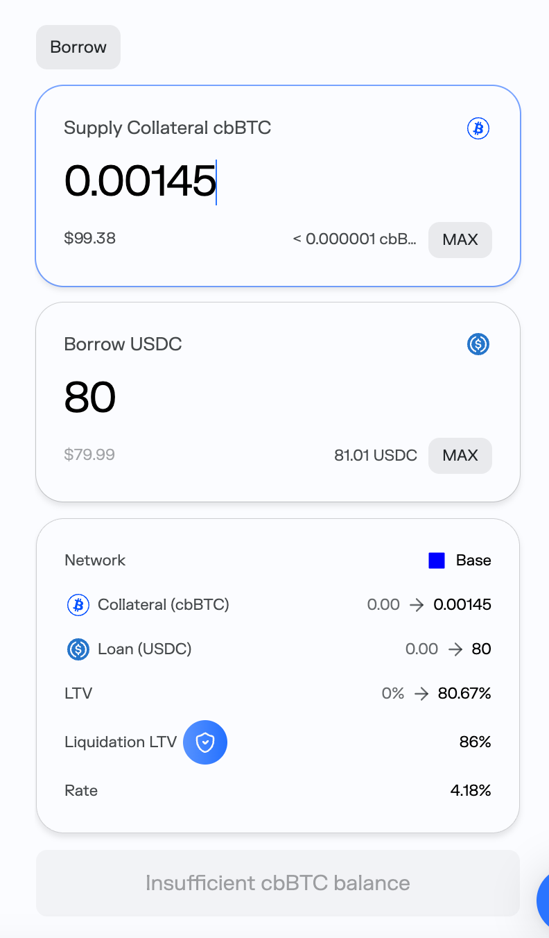 So in our given example around $100 of cbBTC would allow me to borrow up to a maximum of around $81, but that wouldn’t give me much breathing room for liquidation and even a slight drop in cbBTC’s price could liquidate my position.