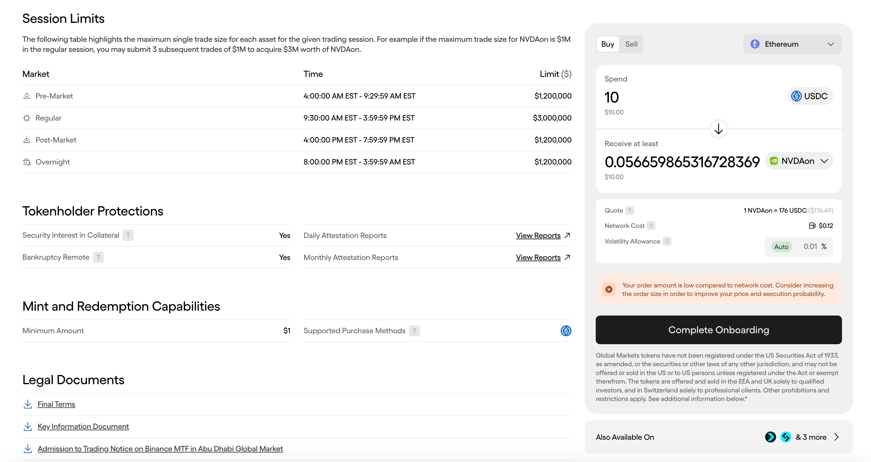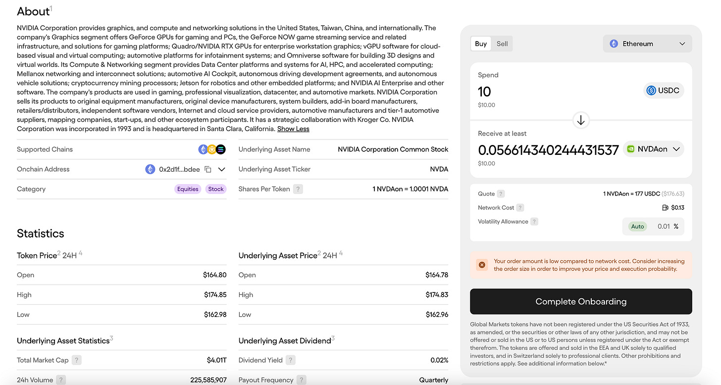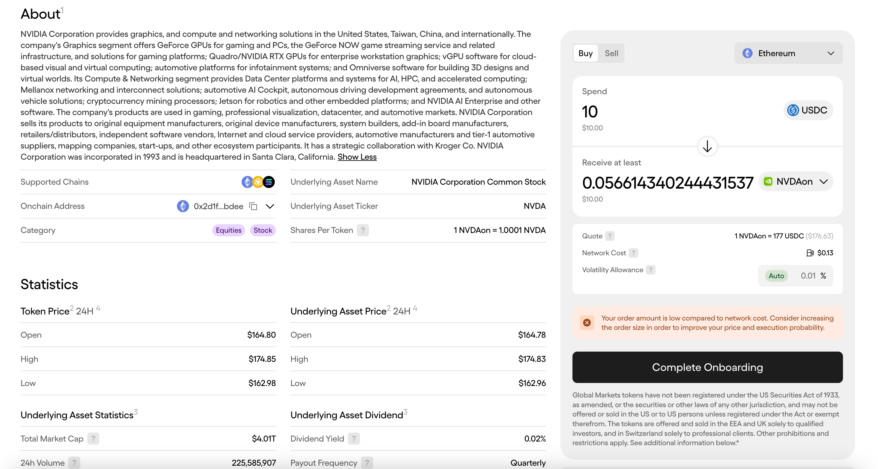 If you look closely you’ll notice that Ondo has its own ticker format for stocks. NVIDIA becomes NVDAon, Amazon becomes AMZNon, with the suffix “on” representing Ondo.