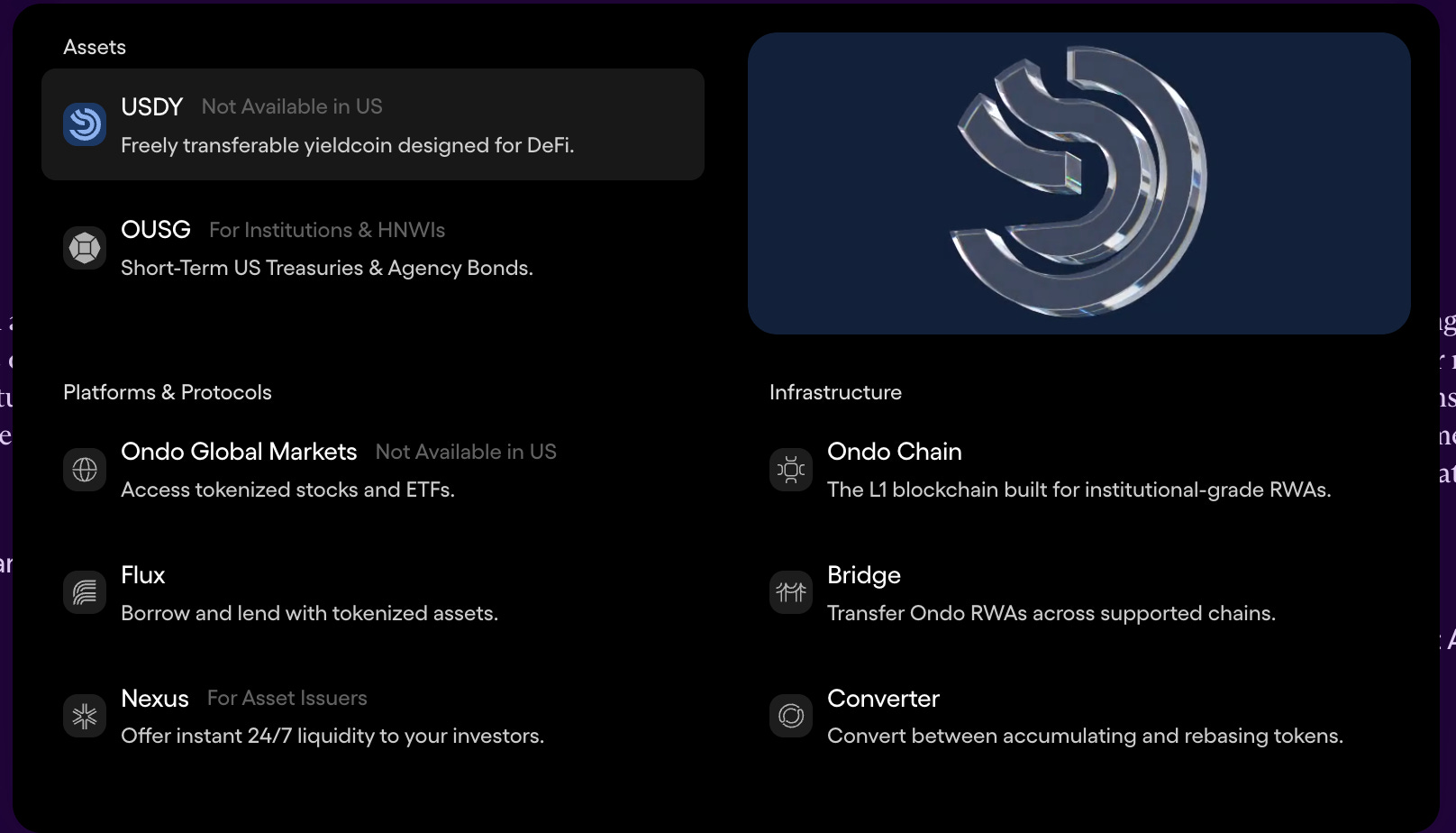 Ondo also have several products. They have: their own USD stablecoin called USDY; their own tokenised treasuries and bonds; tokenised stocks and ETFs under their “Global Markets” product; borrowing and lending in tokenised assets with “Flux”; liquidity through “Nexus”; and their own chain and bridge!