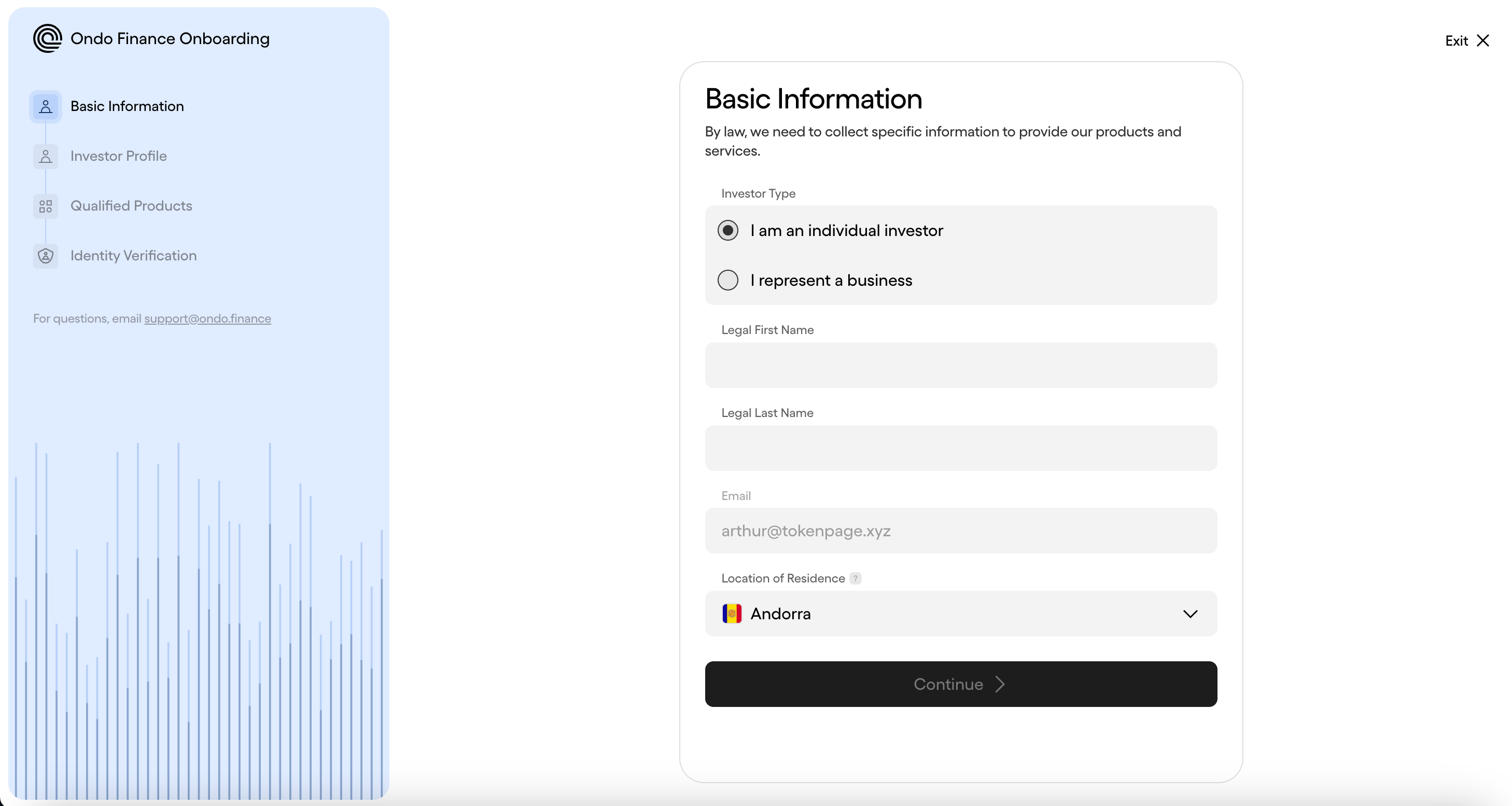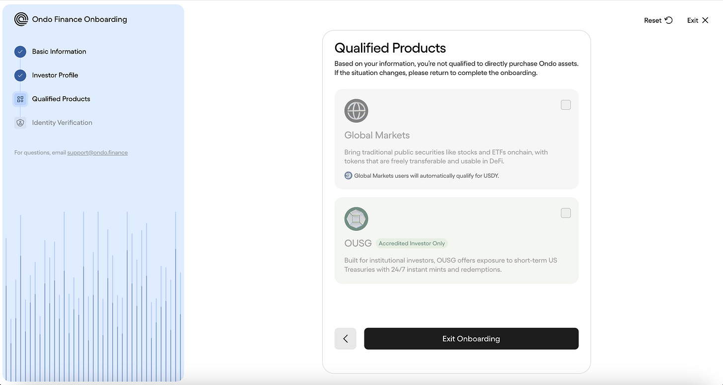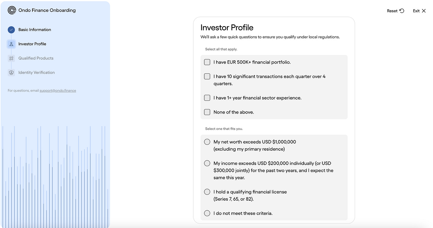 Unlike most of DeFi where you just connect a wallet and get started, onboarding into Ondo requires answering some questions.