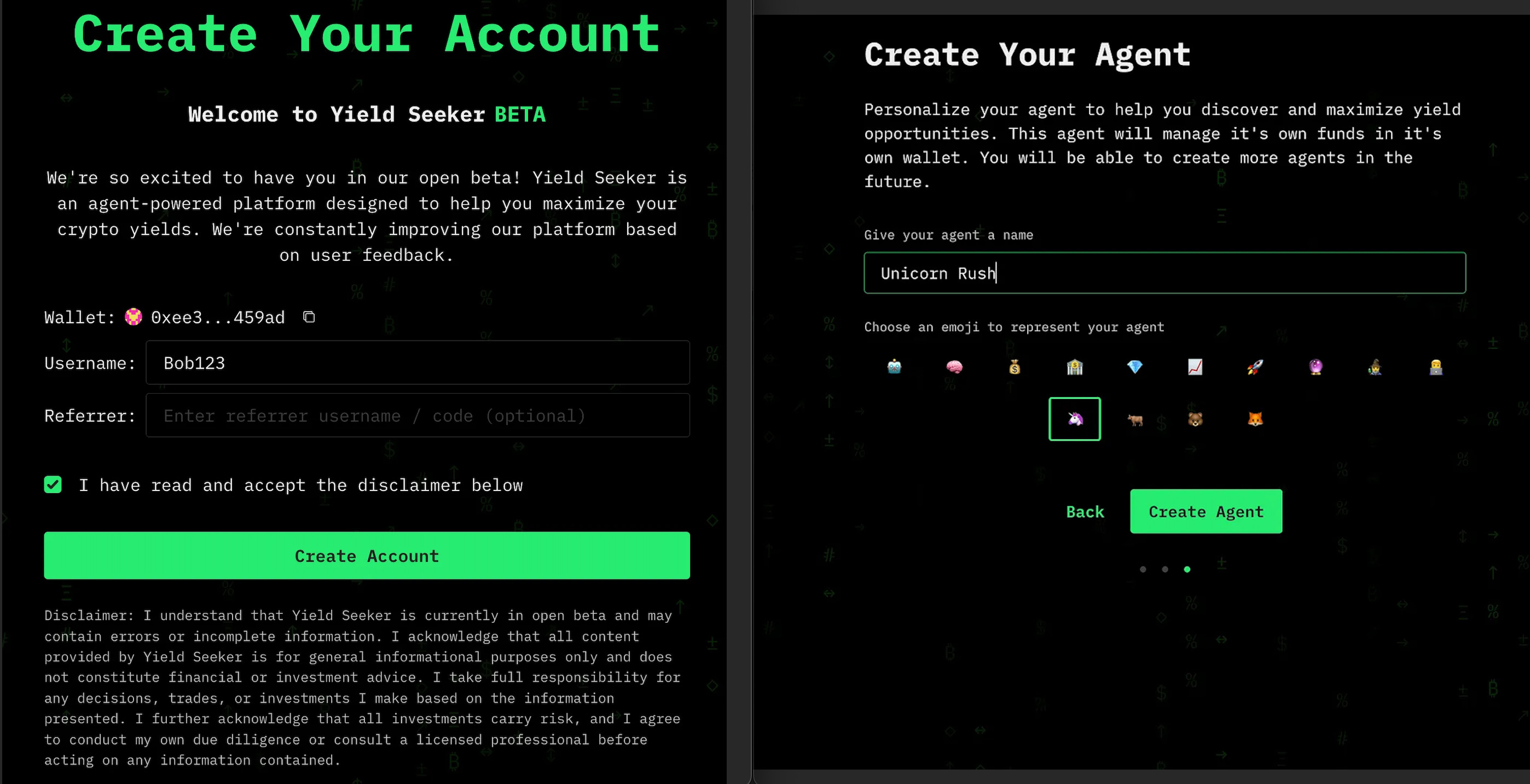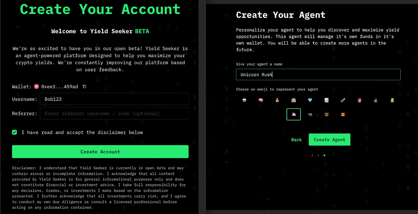 Yield Seeker has a pretty simple onboarding experience when you first start where we ask the user to create an account, read some explanatory text, and then create their own agent and give it a name. Then all you need to do is send some money into your agent in the wallet tab and it’ll do the rest for you.