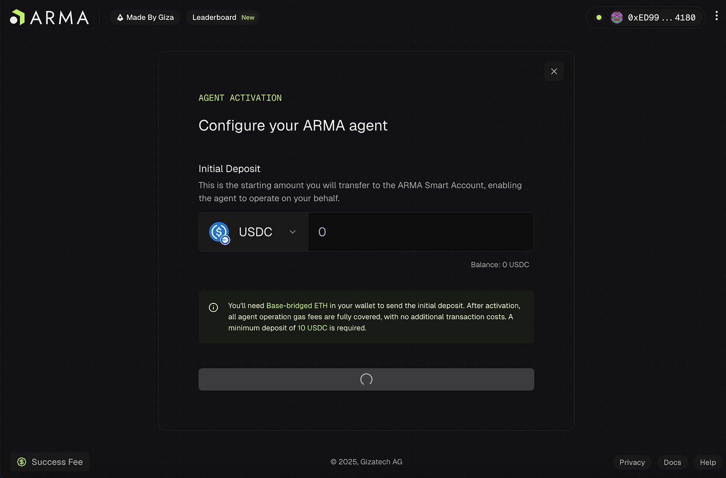 Arma has a very easy onboarding experience and interface, while it’s not as simple as Mamo’s it’s still very simple. When you click activate you’re asked to transfer at least $10 in USDC to your agent to create it with this initial deposit.