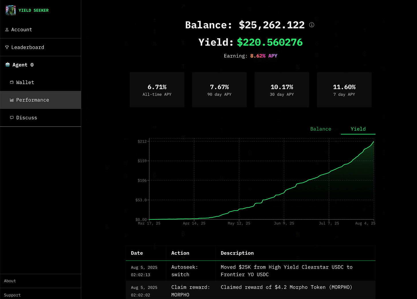 Our agents run our own autoseek strategy that tries to get you the best yield from over 25 vaults. We’re currently integrated with Morpho, Euler, Aave, SparkFi and Compound, and are continuously adding more.