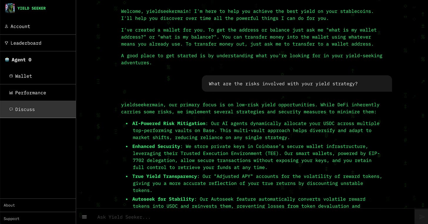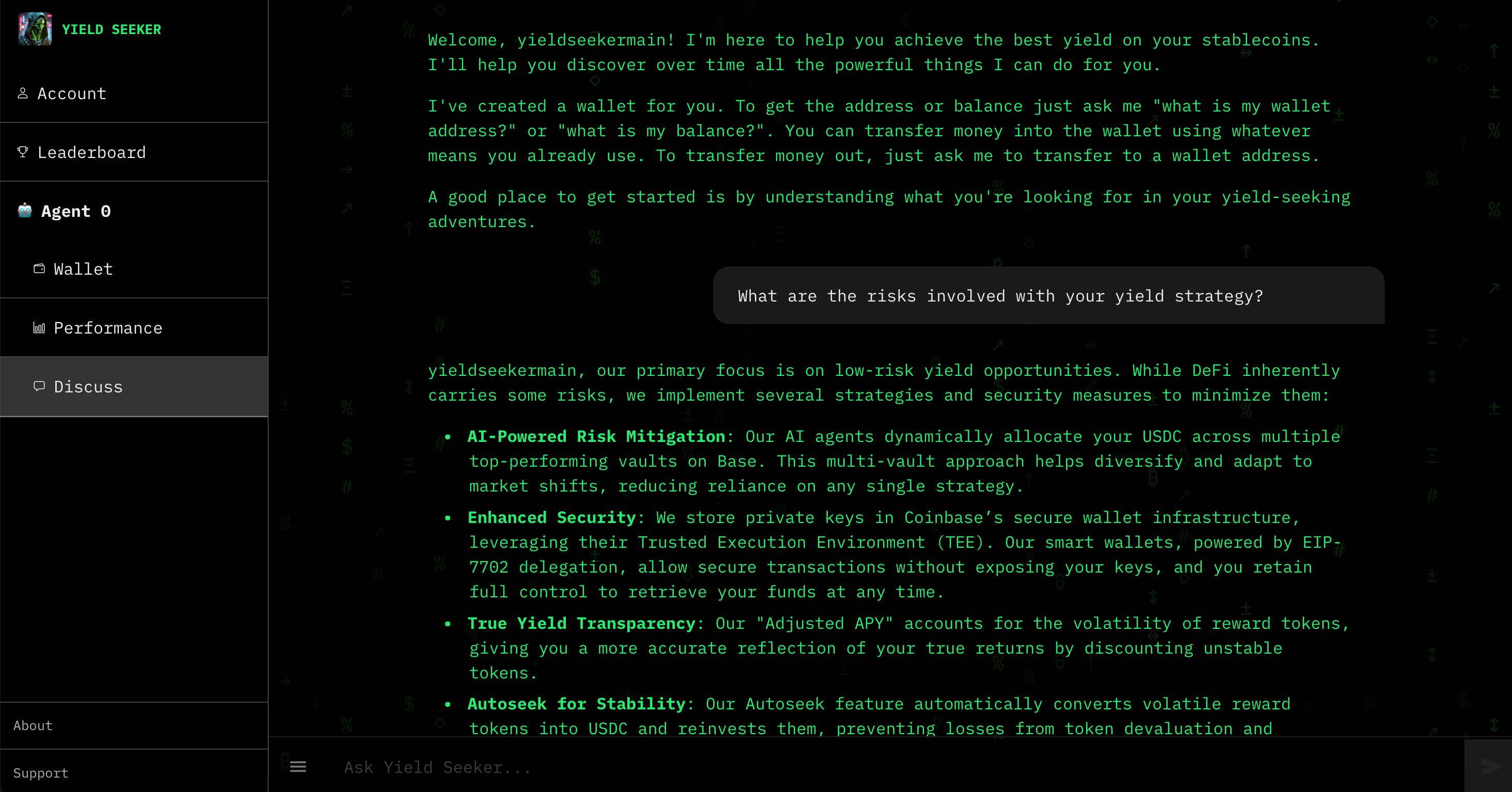 We currently only support USDC on Base, however our long-run vision here is that your agent will eventually be your very own financial manager, so it’ll support more assets on more chains and this conversational aspect will evolve further to allow your agent to truly learn from you and allocate funds appropriately for your risk profile.