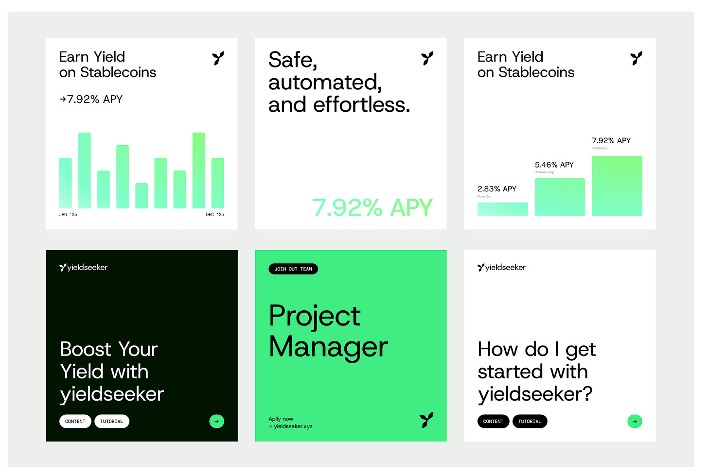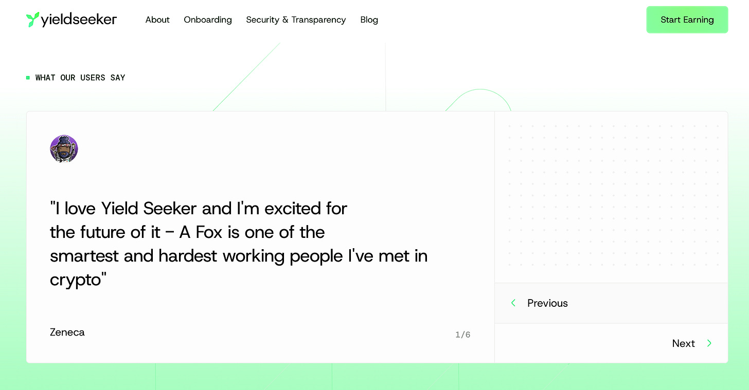 Our original brand hadn’t been too deeply thought through and had more of a degen-crypto look about it, which we realised is contrary to yieldseeker’s intention of being a safe place for users to leave their cryptos and earn low-risk yield on autopilot.